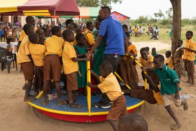 In Ghana, we have partnered with Empower Playgrounds, a non-profit organization that focuses on bringing power and light to rural schools in Ghana and West Africa with innovative electricity-generating merry-go-rounds. Through this partnership not only will we be able to help provide light to these communities, but also access to Joy School English for these children in need. Our goal is to provide Joy School English to as many Empower Playground schools as possible with our 10% revenue donations.